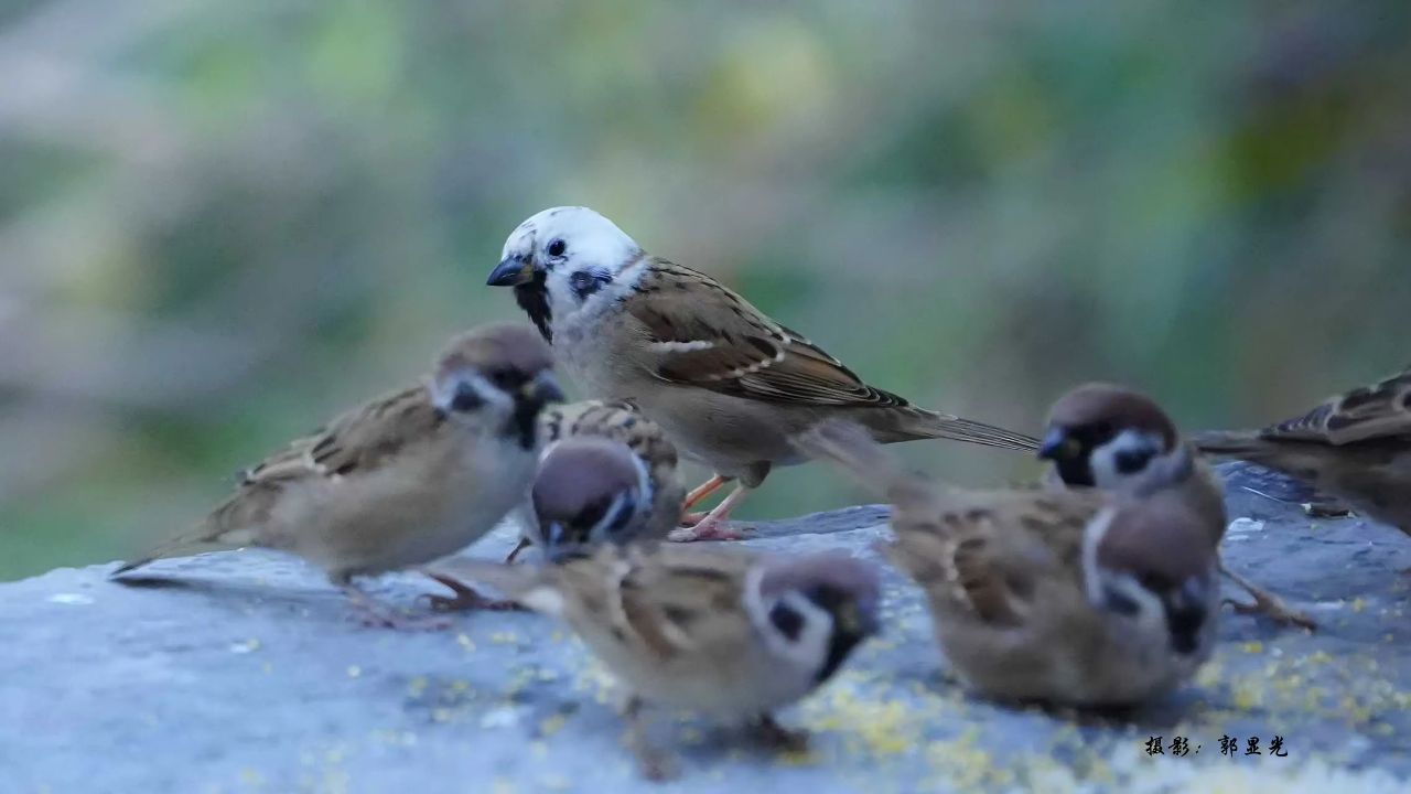 这只老麻雀似乎很有风度,让晚辈们先吃。但这个判断不一定对,因为它是一只白化的麻雀,也许年纪并不大,所以鸟也不可貌相。白化麻雀的本质是麻雀的羽毛、皮肤等部位因基因突变导致