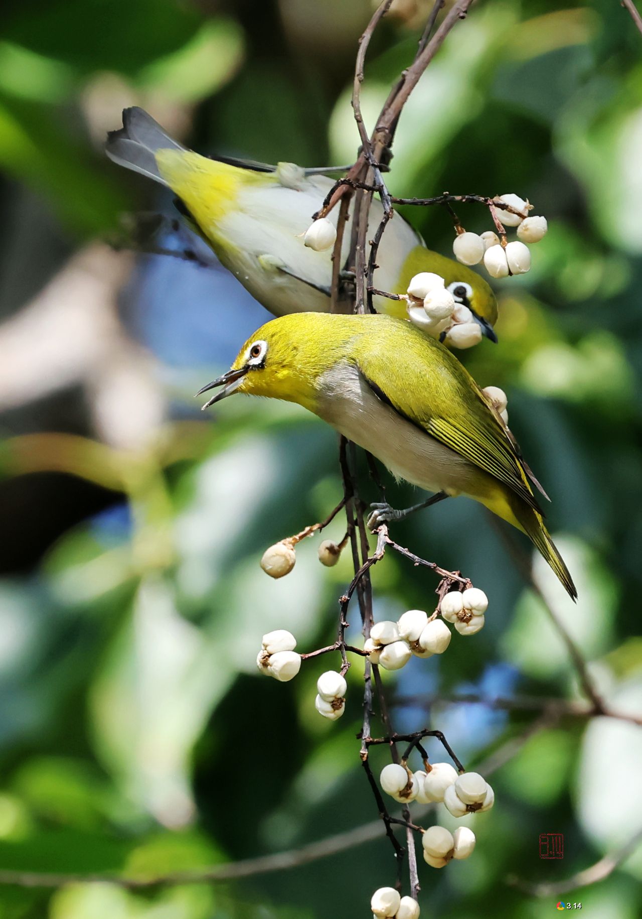 乌桕树是南方常见树种。乌桕的果实是众多鸟类在冬季非常重要的食物,乌桕果实外被的那层白色蜡质假种皮(就是我们看到的白色部分)含有丰富的油脂,能为鸟类在寒冷的秋冬季节提供高效的热量和能量。斑鸠、白头鹎、丝光椋鸟、八哥、乌鸫等这些留鸟是取食乌桕果实的主力军,冬候鸟如图中的暗绿绣眼