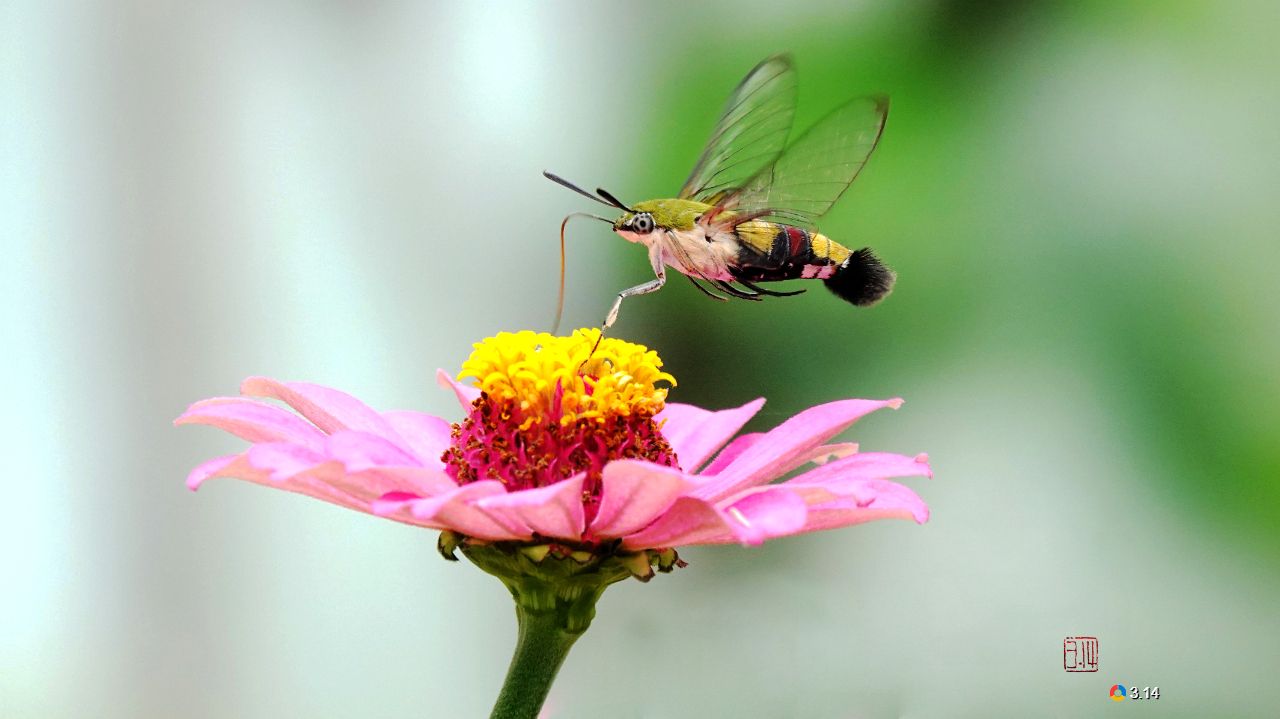 咖啡透翅天蛾,身体纺锤形,翅脉棕黑色,翅膀透明。胸部背面黄绿色,腹面白色。腹部颜色非常有特点:前端草绿色,中部紫红色,后部杏黄色,尾部有黑色毛丛。它们是少数在白天活动的蛾类之一。吸食花蜜时,它们会快速振动翅膀悬停在空中,加上体型和颜色,常被误认为是蜂鸟。分布于中国上海、云南、江西、湖南等多省